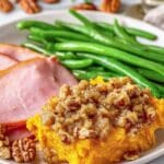 - Add Topping: Evenly sprinkle the pecan crumble topping over the sweet potato mixture in the baking dish.