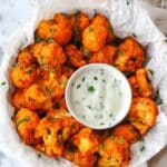 Delicious and spicy Buffalo cauliflower bites that are crispy on the outside and tender on the inside, coated in a flavorful buffalo sauce. These vegetarian bites make a perfect appetizer or game day snack served with ranch or blue cheese dressing and fresh celery and carrot sticks.