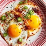 - Serve with garnishes: Slide the fried eggs onto a plate, toast, or a warm bowl of rice. Drizzle any remaining chili oil from the pan over the eggs. Sprinkle with sliced scallions and furikake for a flavorful finish.