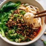 This classic Sichuan Dan Dan Noodles recipe features a bold, spicy, and savory sesame chili oil sauce paired perfectly with tender ground pork and fresh noodles. A traditional Chinese street food favorite, this dish combines flavorful seasonings like Chinese sesame paste, chili paste, soy sauce, and aromatic spices for a satisfying meal with a deliciously numbing kick from Sichuan peppercorns.
