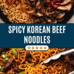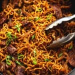 A flavorful and spicy Korean beef noodle dish featuring tender marinated flank steak, savory gochujang sauce, and classic ramen noodles cooked together with onions and mushrooms for a quick and satisfying one-pan dinner.