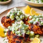 While I wouldn’t recommend freezing the cucumber salad because the yogurt texture changes, the marinated raw chicken can definitely be frozen before cooking. I portion it out in freezer bags with the marinade, and then thaw overnight in the fridge when it’s time to cook. This saved me on busy nights more than once!