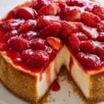 A light yet rich Strawberry Cheesecake featuring a creamy, not overly dense filling and a delicious homemade strawberry sauce topping. This classic dessert uses a buttery biscuit base, smooth cream cheese mixture, and a vibrant strawberry sauce that perfectly complements the creamy texture.