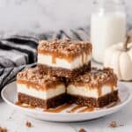 After baking and chilling, I tightly cover these pumpkin cheesecake bars with plastic wrap or store them in an airtight container in the refrigerator. They keep beautifully for up to 5 days and honestly taste even better after a day or two because the flavors meld more.