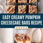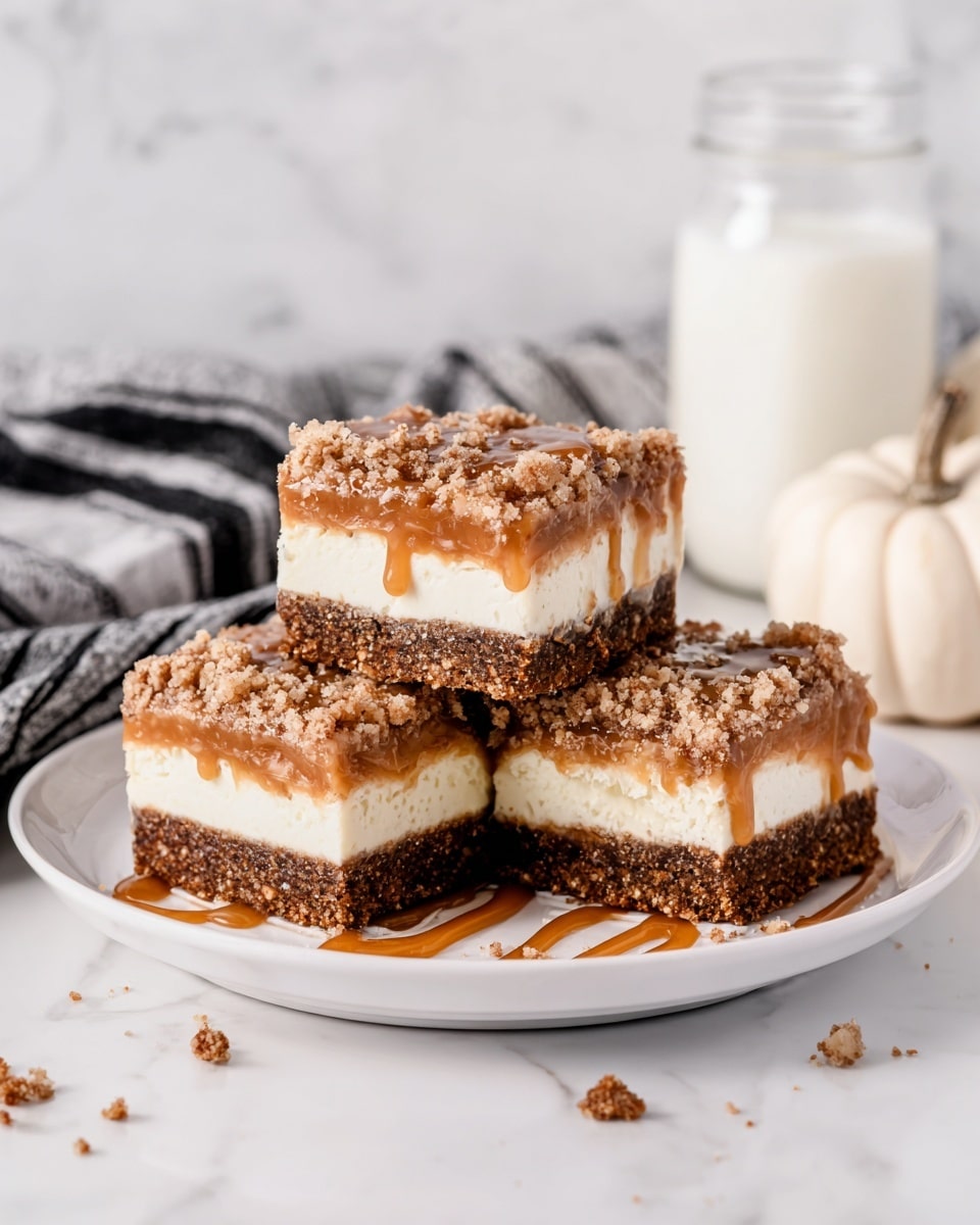These Streusel Pumpkin Cheesecake Bars combine the creamy richness of classic cheesecake with the warm, spiced flavor of pumpkin and autumn spices, all topped with a buttery cinnamon streusel and drizzled with sweet icing and caramel sauce. Perfect for fall celebrations or a cozy dessert treat.