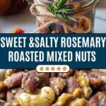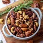 Deliciously addictive sweet and salty rosemary roasted mixed nuts featuring a blend of cashews, walnuts, almonds, and pecans. Coated with a maple syrup glaze, fresh rosemary, brown sugar, and sea salt, then roasted to golden perfection for a savory, mildly sweet snack. Perfect for casual snacking or as a flavorful gift.
