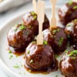 Once, for a party, I arranged the meatballs on a large platter with toothpicks, surrounded by small bowls of extra dipping sauce and colorful veggie sticks. It makes for beautiful finger food that guests love digging into. Another fun idea is to serve them on mini slider buns with a dollop of coleslaw to turn these into bite-size sandwiches!