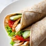 I don’t recommend freezing these wraps once made because the fresh veggies and mayo don’t hold up well. However, you can freeze cooked grilled chicken strips ahead of time and thaw when needed to save prep time.