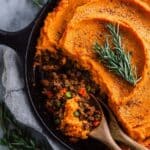 Sweet Potato Shepherd’s Pie is a nutritious and hearty meal featuring a savory ground beef and vegetable filling topped with creamy mashed sweet potatoes. This comforting dish combines tender carrots, peppers, mushrooms, and garlic with ground beef, seasoned with chili powder and rosemary, all baked under a smooth, flavorful sweet potato mash. Perfect for a wholesome family dinner, it’s gluten-free and can be adapted for various dietary needs.