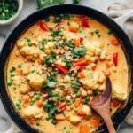 A vibrant and cozy Thai Peanut Coconut Cauliflower Chickpea Curry recipe that combines bold flavors, colorful vegetables, and plant-based protein. This one-pan vegetarian curry is easy to prepare and packed with nutrients, perfect for a satisfying weekday meal that comes together in just 30 minutes.