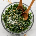 Since this salad relies on fresh kale and crispy bread, freezing isn’t ideal. I wouldn’t recommend freezing this Toasted Bread Parmesan Kale Salad Recipe because the texture and flavors change too much after thawing.