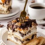 Toffee Tiramisu is a decadent, no-bake layered dessert featuring rich mascarpone and cream cheese blended with caramel sauce, paired with espresso-dipped ladyfingers, crunchy Toffee Crunch Oreo cookies, and Heath toffee bits. This creamy, sweet treat is topped with chocolate fudge, extra caramel drizzle, and whipped cream, creating a perfect balance of smooth textures and toffee flavors.