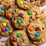 Deliciously soft and chewy Trail Mix Cookies packed with peanut butter, oats, chocolate chips, M&M’s, roasted peanuts, and chopped almonds. These cookies combine the best of a classic peanut butter cookie with the added texture and flavor of your favorite trail mix ingredients. Slightly sweetened with brown sugar and honey, they are perfect for snacking or as a special treat.