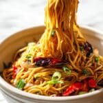 Let the pasta soak up the sauce for a few minutes on low heat, then fold in roasted cashews or peanuts along with the green parts of the scallions. Taste and adjust seasoning with salt or a pinch more sugar if needed. A drizzle of sesame oil right at the end really brings that extra fragrant touch.