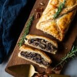 The beauty of this Vegan Mushroom Wellington with Pecans Recipe is in its earthy, natural flavors coming from the mushrooms, fresh herbs, and toasted nuts—all wrapped in that flaky, buttery puff pastry. Shopping for the best mushrooms you can find will really elevate the dish, and having your pastry cold but pliable makes all the difference.