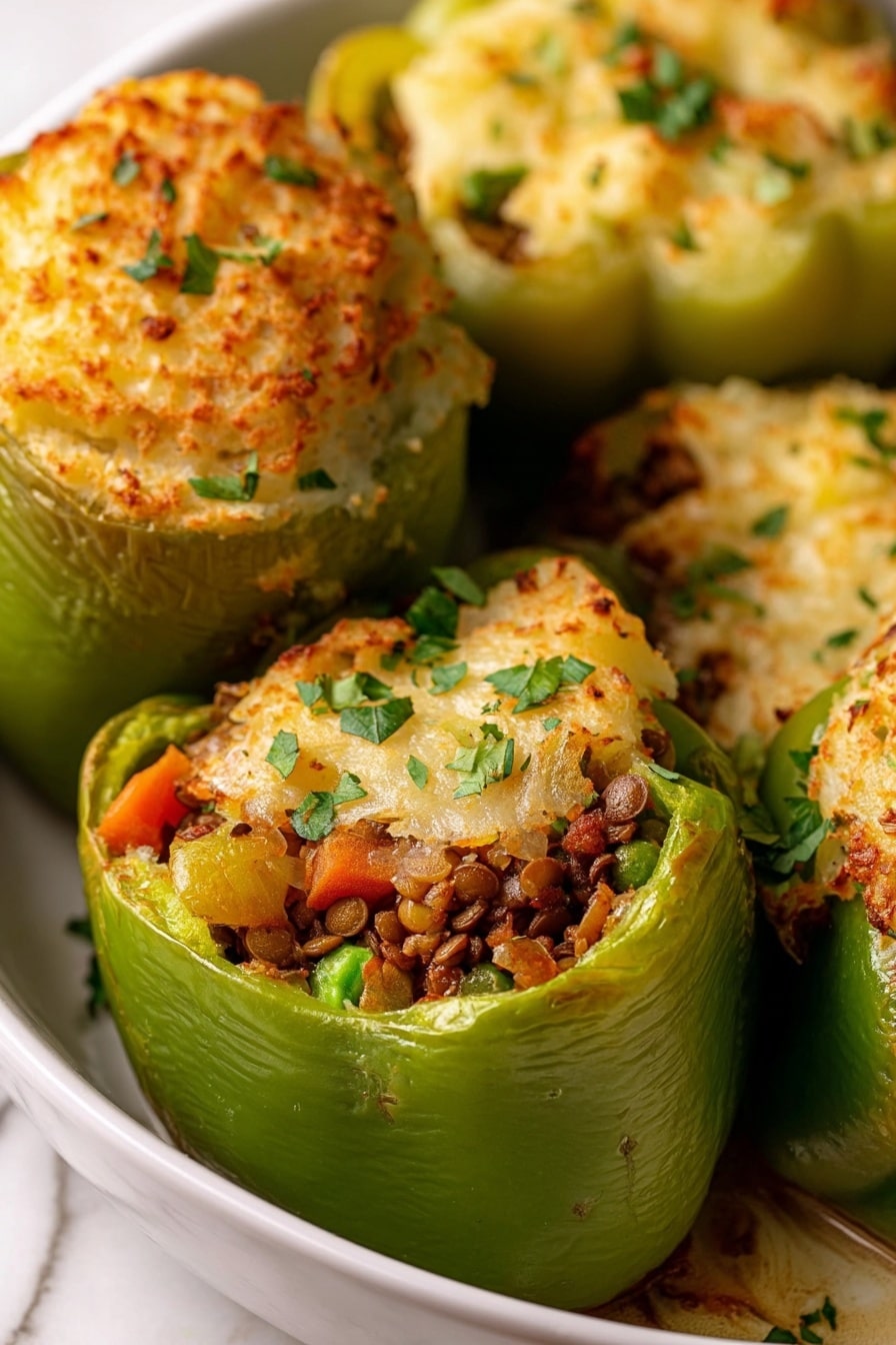 Preheat your oven to 400°F. Cut the tops off the green bell peppers and scoop out the seeds and membranes. Place the peppers standing upright in a baking dish. Spoon the lentil and veggie filling into each pepper, filling them about three-quarters full to leave room for the topping. Then gently pile on the creamy mashed potatoes as the crowning glory. This assembly moment always feels so satisfying to me—it’s like crafting your own edible masterpiece!