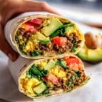 These Tofu Scramble Breakfast Burritos are a delicious and satisfying vegan brunch option, featuring a flavorful tofu scramble with soyrizo, sautéed vegetables, and creamy avocado, all wrapped in a warm flour tortilla and topped with vegan chipotle mayo and spinach.