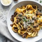 Finish up by tasting and seasoning with more salt and pepper if needed. Then sprinkle Parmesan cheese and chopped parsley on top for a fresh and cheesy finish. Serve immediately—you’ll love how the sauce clings to those tender noodles and mushrooms.