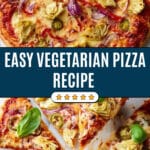 This Vegetarian Pizza recipe features a crispy, golden crust topped with a flavorful blend of mozzarella, Asiago, and pecorino cheeses, complemented by a medley of vibrant vegetables including roasted red peppers, artichokes, red onion, and optional jalapeño for a hint of heat. Finished with a drizzle of olive oil, red pepper flakes, and fresh basil, it’s an irresistible vegetarian pizza perfect for a satisfying dinner or casual gathering.
