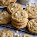 To warm up leftover cookies, I pop them in a preheated oven at 150ºC (fan) for 5 minutes or microwave them for 10-15 seconds. This brings back that fresh-from-the-oven softness and makes the white chocolate chips deliciously melty again.