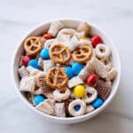 I’ve frozen this party mix in zip-top bags for longer storage with success. Just freeze it in portioned bags and thaw at room temperature before serving. The texture holds up surprisingly well, though the white chocolate coating might soften slightly. It’s a great option when you want to prep in advance.