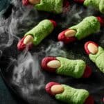 Witch Finger Cookies are spooky and delicious treats perfect for Halloween. These cookies feature buttery, almond-flavored dough colored green and shaped like creepy fingers, adorned with almond slices as fingernails and pistachio pieces for warts. A dollop of fruit jam oozes from under the almond nails, adding a sweet and slightly tart finish. Crunchy nuts and a soft crumb make these cookies a fun and festive dessert.