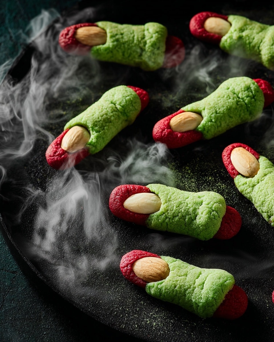 Witch Finger Cookies are spooky and delicious treats perfect for Halloween. These cookies feature buttery, almond-flavored dough colored green and shaped like creepy fingers, adorned with almond slices as fingernails and pistachio pieces for warts. A dollop of fruit jam oozes from under the almond nails, adding a sweet and slightly tart finish. Crunchy nuts and a soft crumb make these cookies a fun and festive dessert.